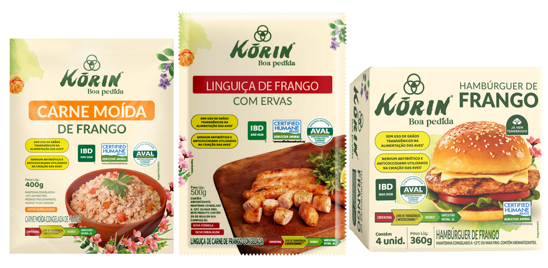Novos prosutos Korin-Korin-apresenta-Hamburguer-de-Frango-Linguica-de-Frango-com-ervas-e-Carne-Moida-de-Frango-da-linha-Boa-Pedida-em-nova-formulacao-e-embalagem-renovada-Foto-Korin